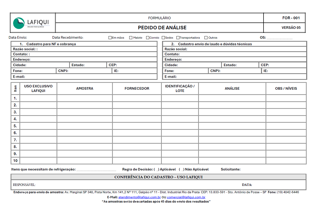 Orçamento Empresa / Instituição CNPJ / CPF Nome Completo E-mail Telefone De onde conheceu o Lafiqui? Análises e Tipo de produto Enviar Para o envio de amostras, favor utilizar o formulário abaixo: Solicite sua Análise